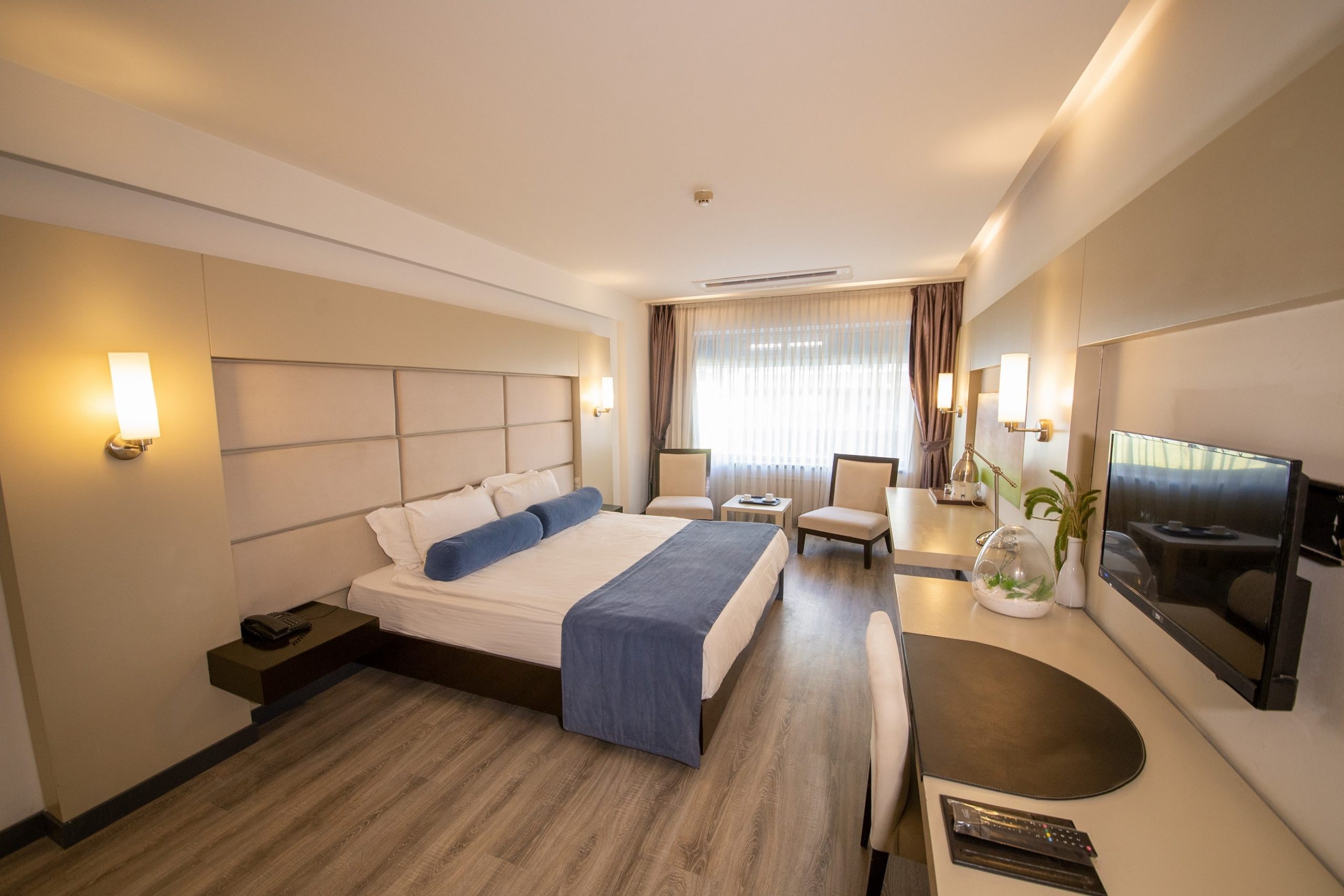 Farklı büyüklüklerdeki modern ve şık dekorasyonlu odalarımız, konforu bir konaklama geçirmeniz için tüm ihtiyaçlarınız düşünülerek tasarlandı.